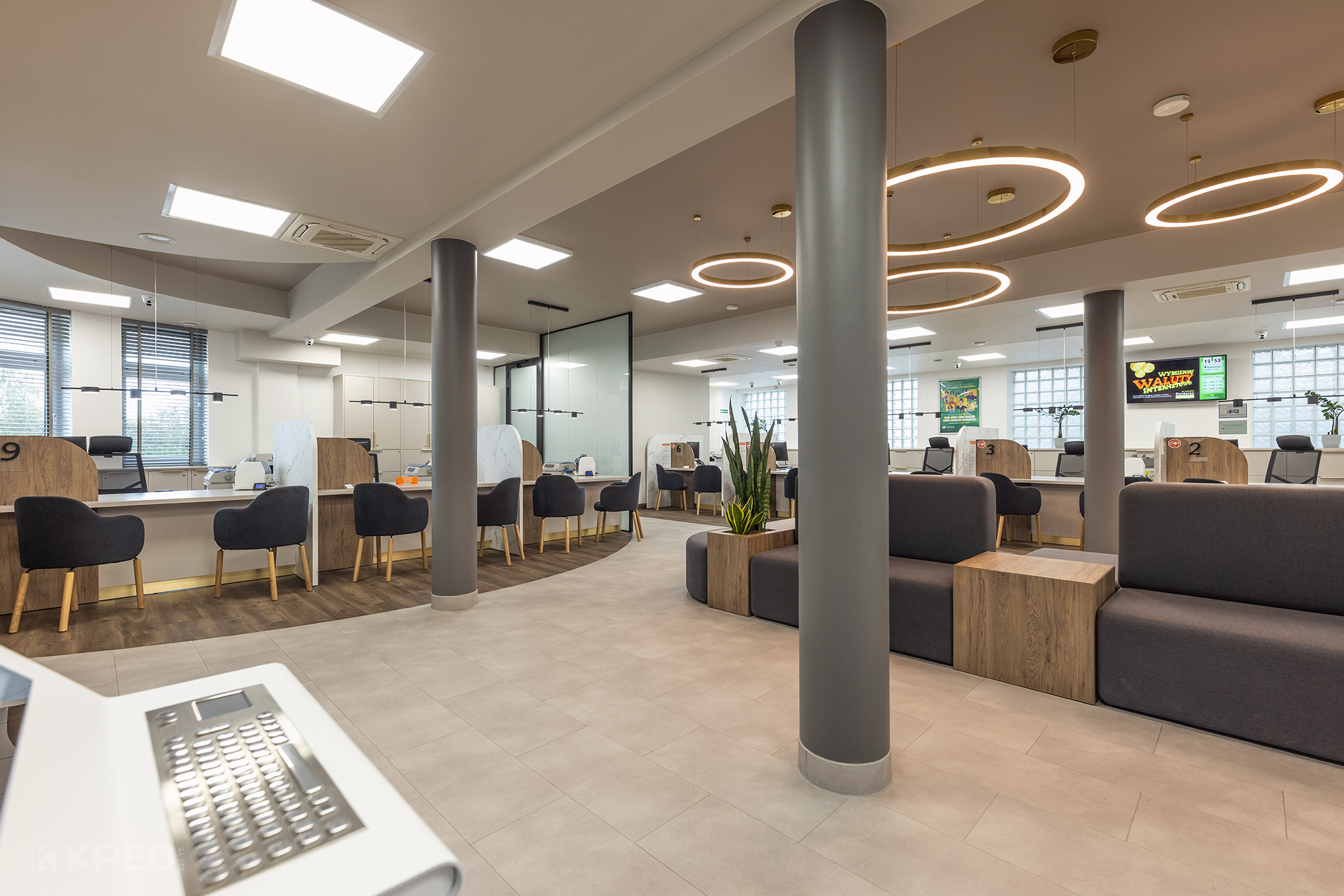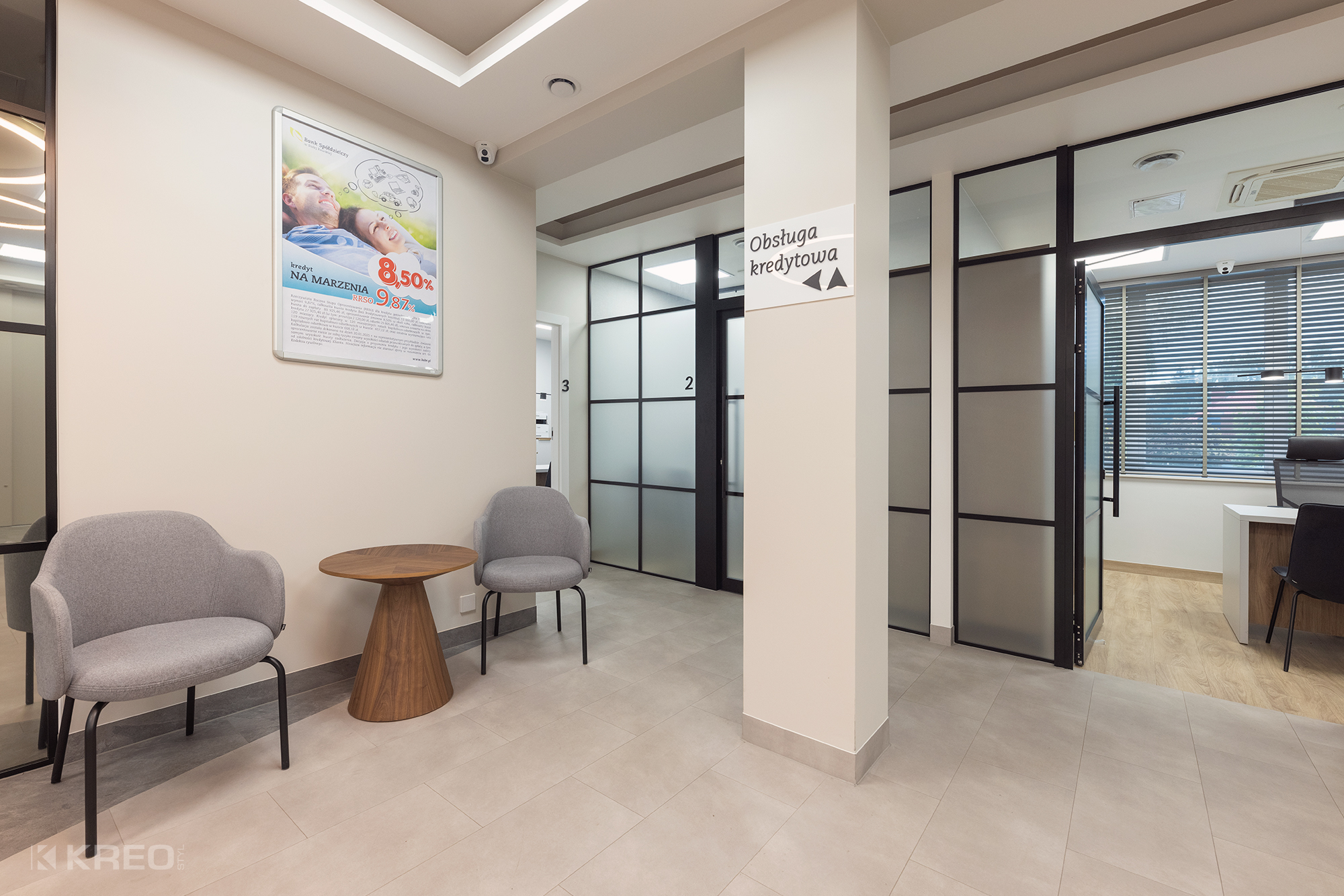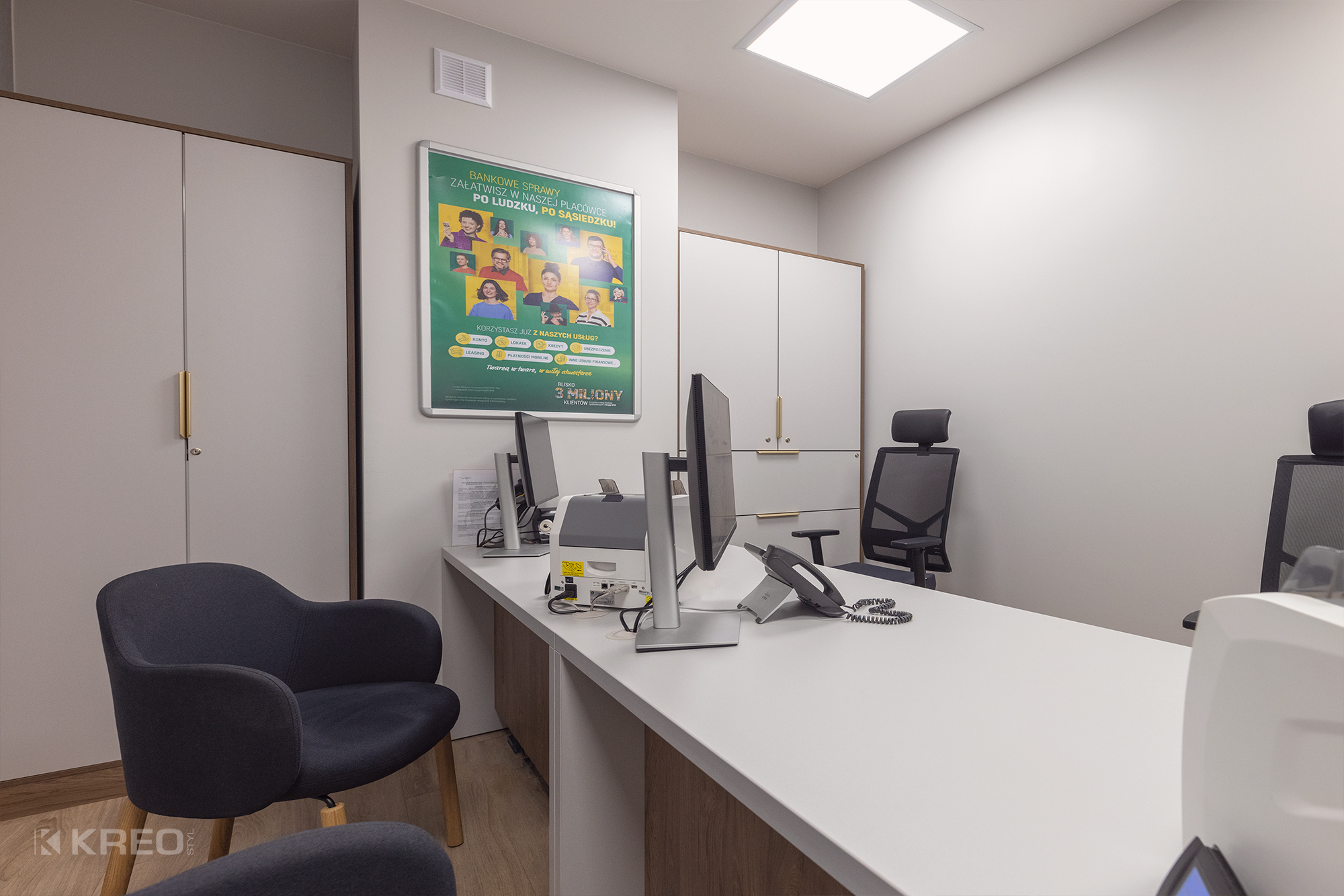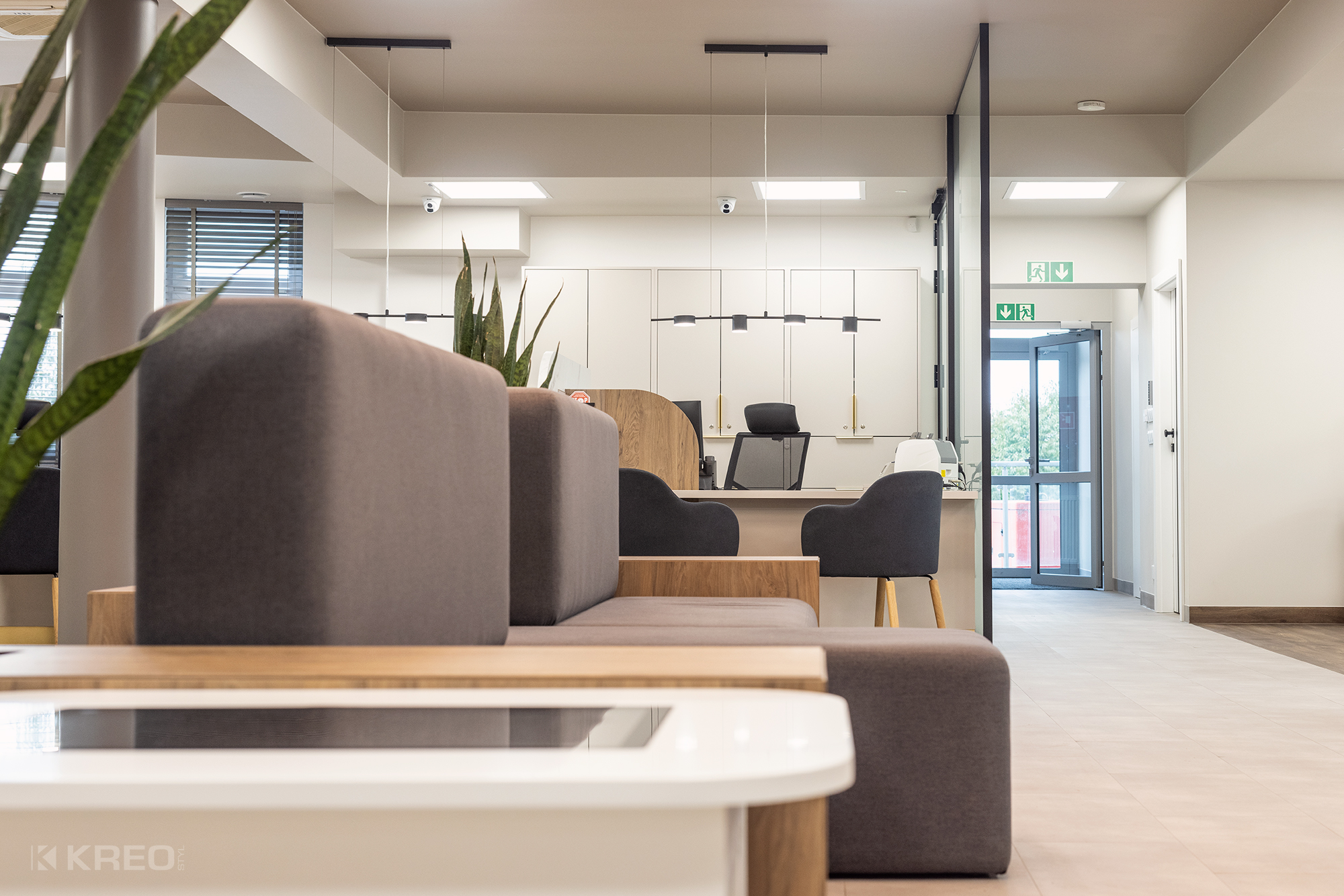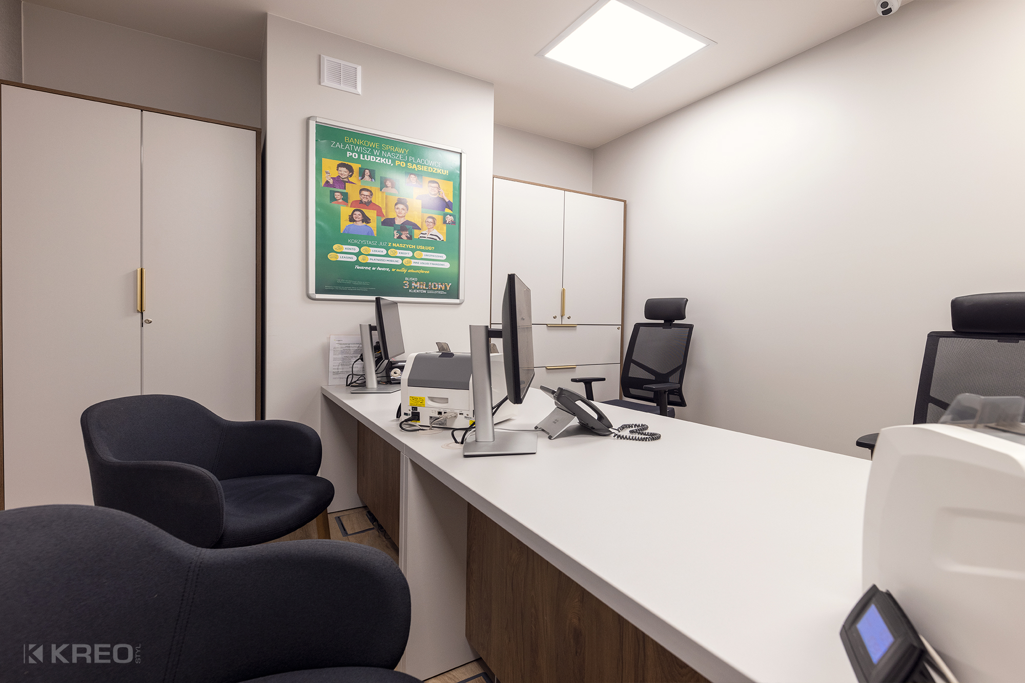 We designed and comprehensively fitted out the bank's space, creating an interior that combines the functionality of a public institution with a sense of trust and security. Our task was not only to create an ergonomic and modern workspace but also to give it a unique character – consistent with the prestige and mission of the financial institution. In the implementation, we used natural materials and minimalist forms that emphasize professionalism while simultaneously instilling peace and harmony. This ensures that the bank's stakeholders feel fully cared for, and employees feel safe and focused on their duties. The interior is equipped with custom-made office furniture: built-ins, desks, chairs, and tables that support daily work and ensure comfort. The director's office occupies a special place in the design – an elegant, representative space conducive to key decision-making. Subtle gold accents in the furniture handles and details evoke values and financial stability, without overwhelming the minimalist composition. Also noteworthy are the veneered column upholstery and the flush-fitting door to the director's office – elements that demonstrate precision craftsmanship and attention to detail. The overall effect is a space that exudes confidence, tranquility, and elegance. The main hall features upholstered sofas and chairs for clients, whose shapes and materials perfectly complement the other furnishings, creating a cohesive, aesthetic, and functional whole. The bathroom, whose design fully complements the overall design, completes the overall look. Our project for the bank is an example of how commercial interior design can combine a representative character with ergonomics and durability, offering solutions tailored to the needs of the most demanding institutions.