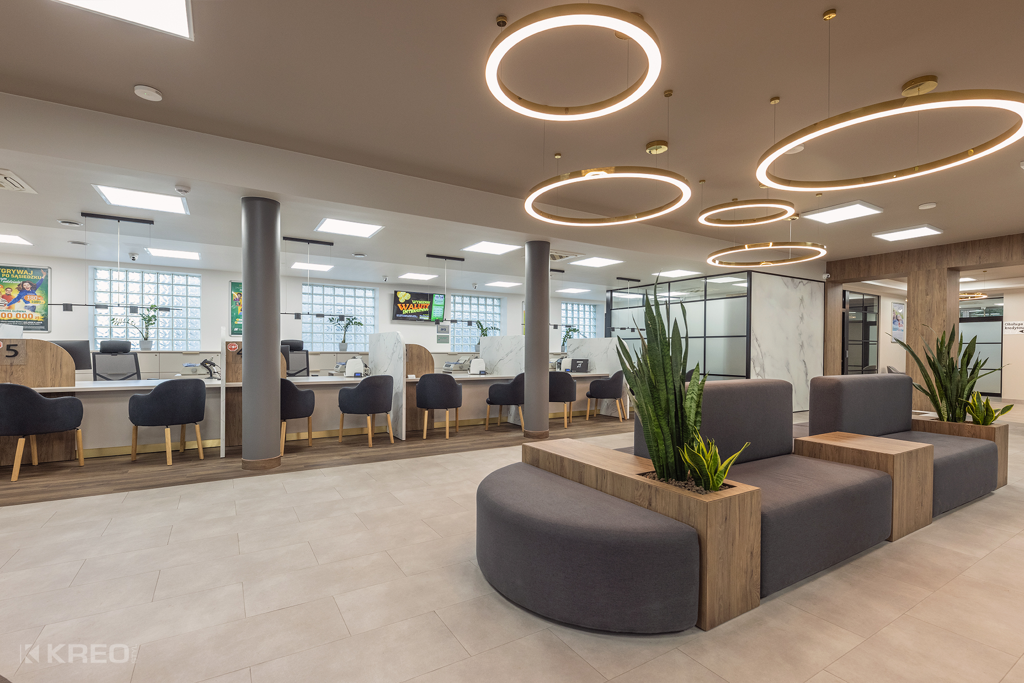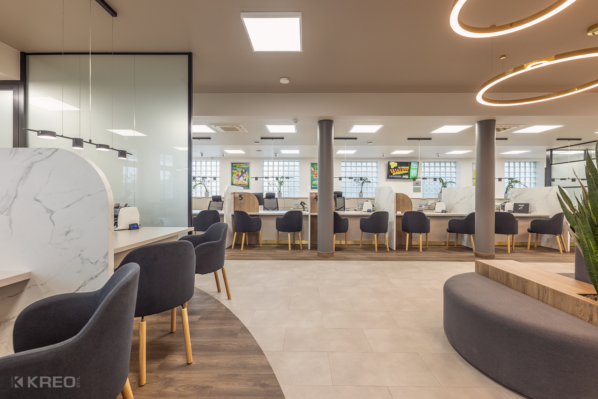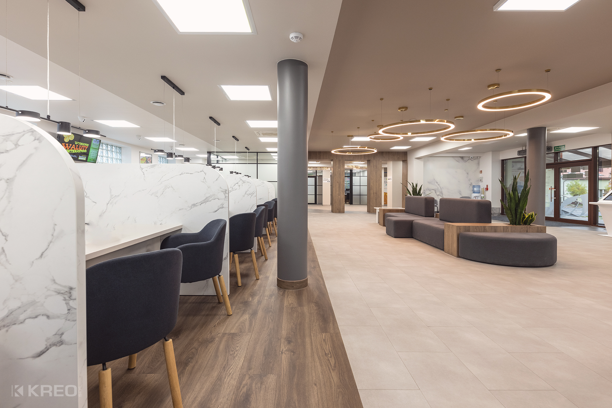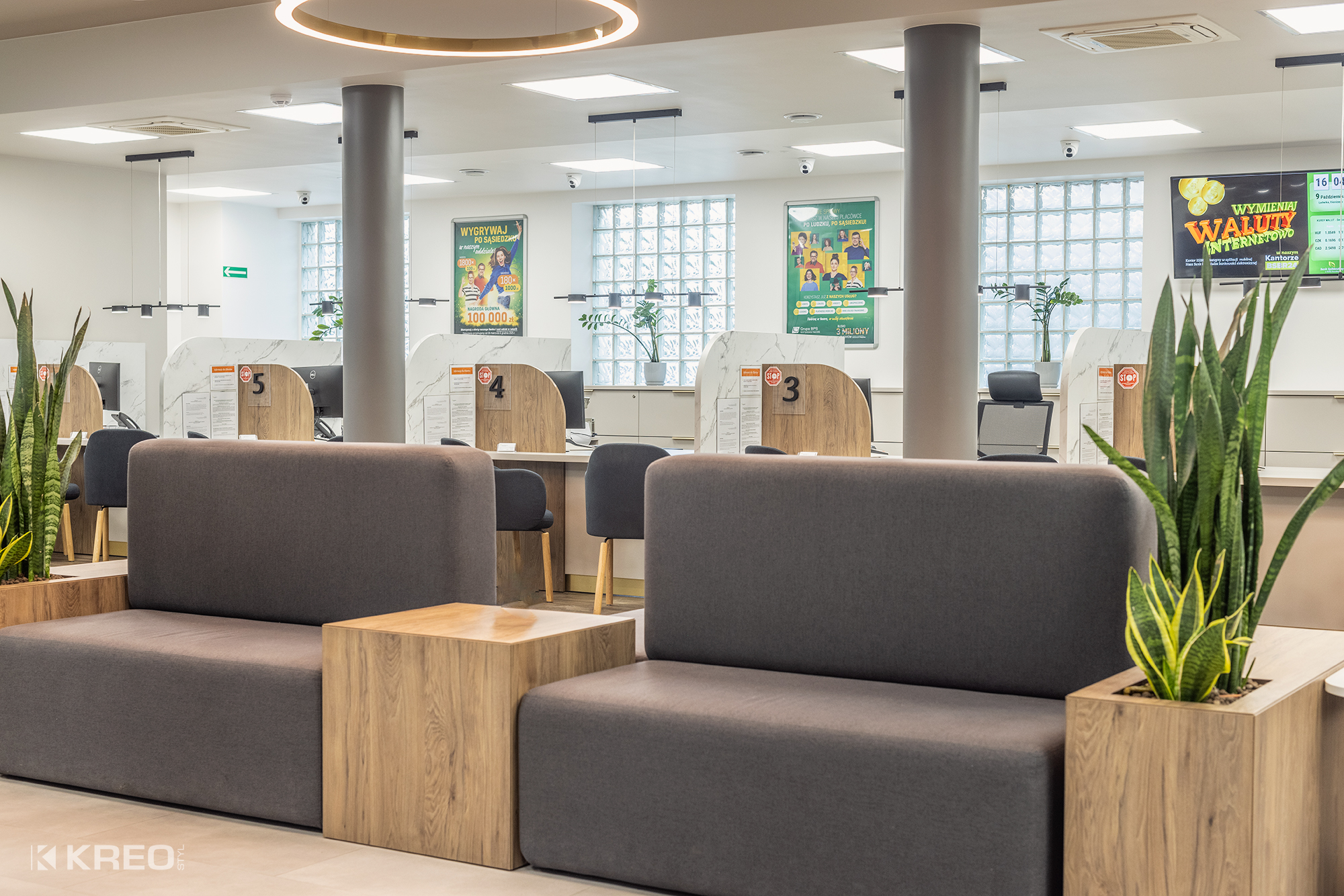 We designed and comprehensively fitted out the bank's space, creating an interior that combines the functionality of a public institution with a sense of trust and security. Our task was not only to create an ergonomic and modern workspace but also to give it a unique character – consistent with the prestige and mission of the financial institution. In the implementation, we used natural materials and minimalist forms that emphasize professionalism while simultaneously instilling peace and harmony. This ensures that the bank's stakeholders feel fully cared for, and employees feel safe and focused on their duties. The interior is equipped with custom-made office furniture: built-ins, desks, chairs, and tables that support daily work and ensure comfort. The director's office occupies a special place in the design – an elegant, representative space conducive to key decision-making. Subtle gold accents in the furniture handles and details evoke values and financial stability, without overwhelming the minimalist composition. Also noteworthy are the veneered column upholstery and the flush-fitting door to the director's office – elements that demonstrate precision craftsmanship and attention to detail. The overall effect is a space that exudes confidence, tranquility, and elegance. The main hall features upholstered sofas and chairs for clients, whose shapes and materials perfectly complement the other furnishings, creating a cohesive, aesthetic, and functional whole. The bathroom, whose design fully complements the overall design, completes the overall look. Our project for the bank is an example of how commercial interior design can combine a representative character with ergonomics and durability, offering solutions tailored to the needs of the most demanding institutions.