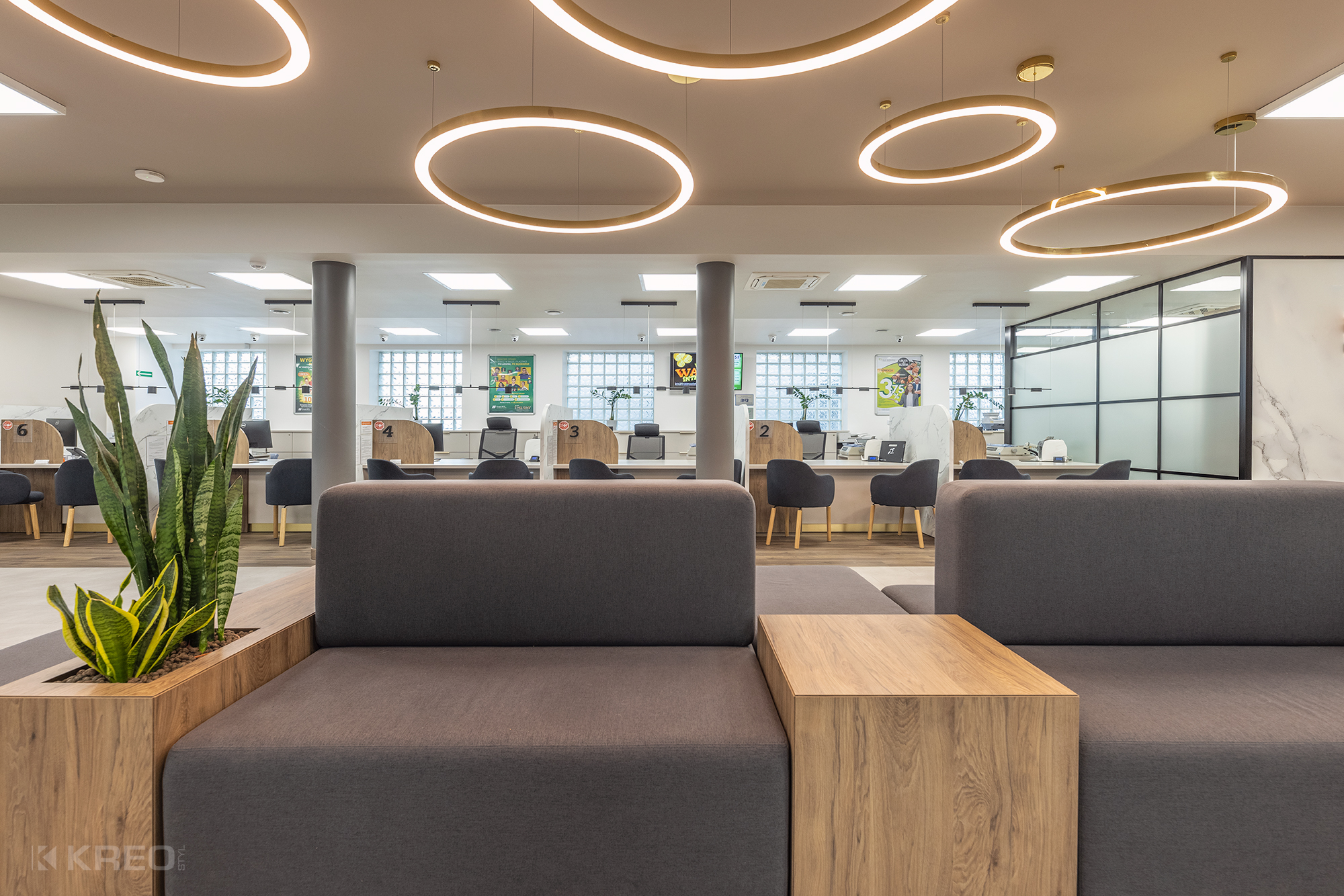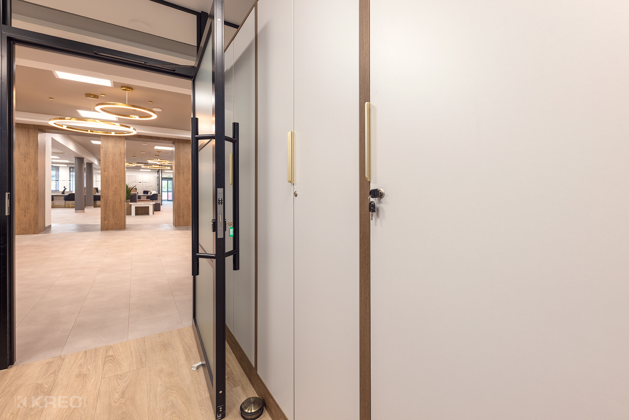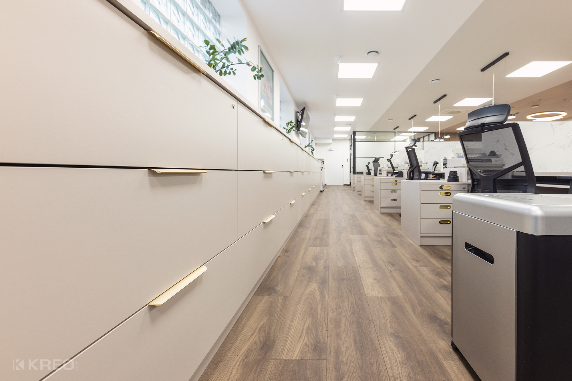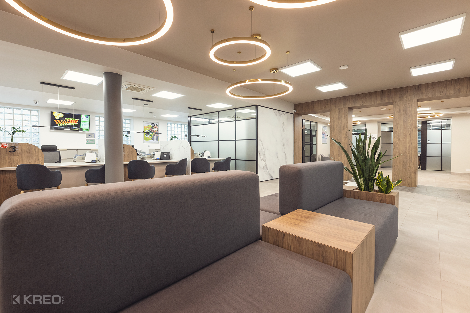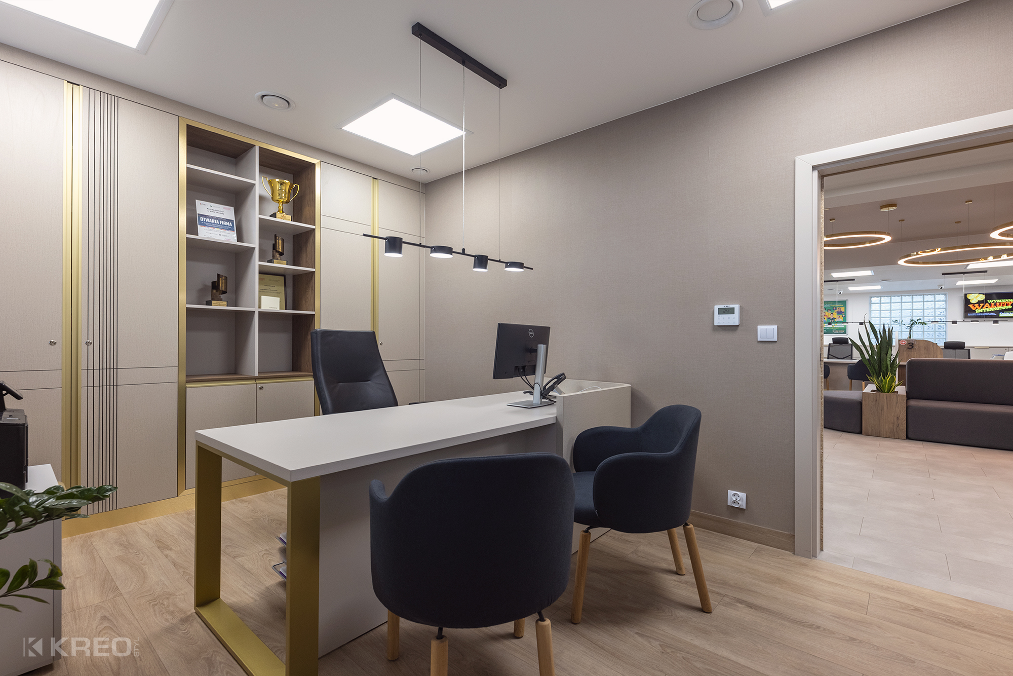 We designed and comprehensively fitted out the bank's space, creating an interior that combines the functionality of a public institution with a sense of trust and security. Our task was not only to create an ergonomic and modern workspace but also to give it a unique character – consistent with the prestige and mission of the financial institution. In the implementation, we used natural materials and minimalist forms that emphasize professionalism while simultaneously instilling peace and harmony. This ensures that the bank's stakeholders feel fully cared for, and employees feel safe and focused on their duties. The interior is equipped with custom-made office furniture: built-ins, desks, chairs, and tables that support daily work and ensure comfort. The director's office occupies a special place in the design – an elegant, representative space conducive to key decision-making. Subtle gold accents in the furniture handles and details evoke values and financial stability, without overwhelming the minimalist composition. Also noteworthy are the veneered column upholstery and the flush-fitting door to the director's office – elements that demonstrate precision craftsmanship and attention to detail. The overall effect is a space that exudes confidence, tranquility, and elegance. The main hall features upholstered sofas and chairs for clients, whose shapes and materials perfectly complement the other furnishings, creating a cohesive, aesthetic, and functional whole. The bathroom, whose design fully complements the overall design, completes the overall look. Our project for the bank is an example of how commercial interior design can combine a representative character with ergonomics and durability, offering solutions tailored to the needs of the most demanding institutions.