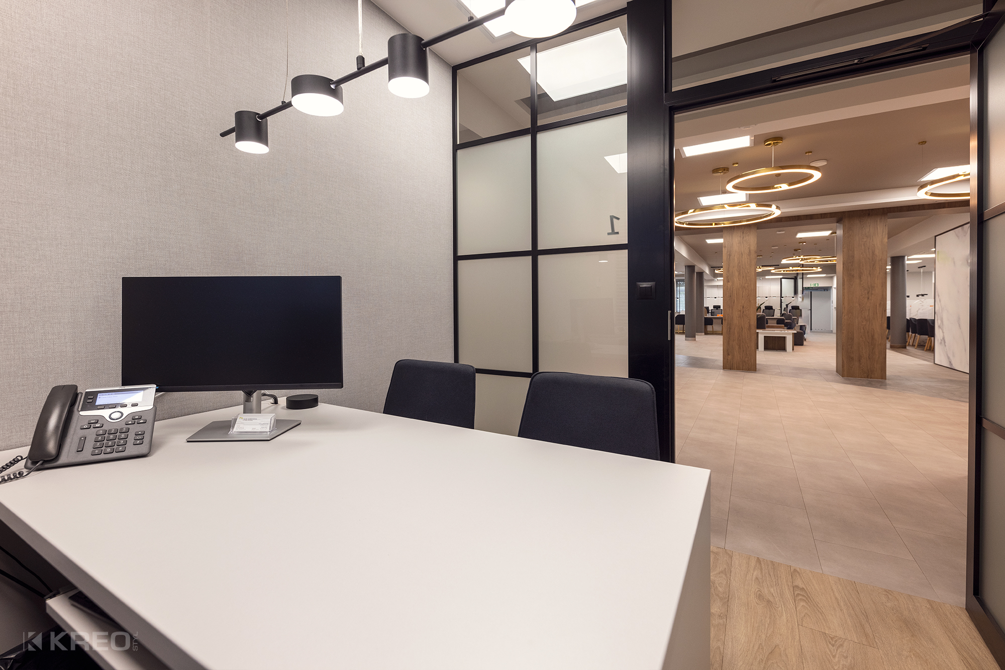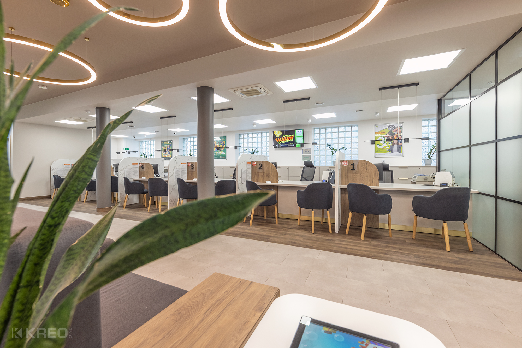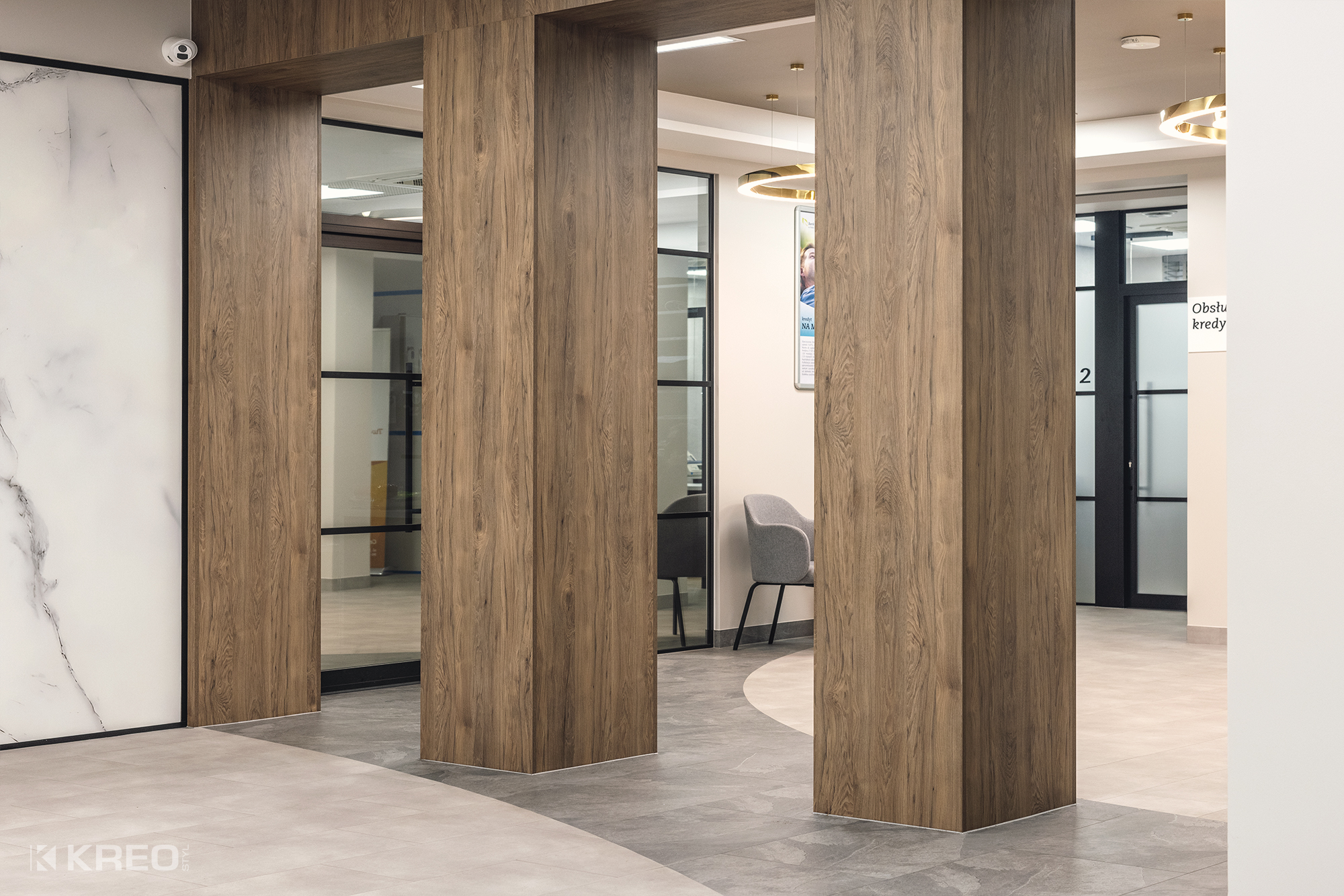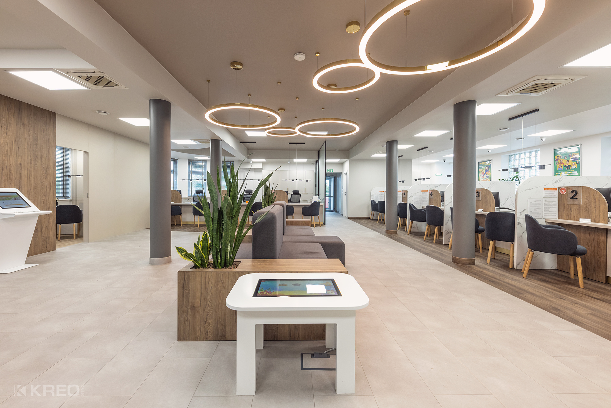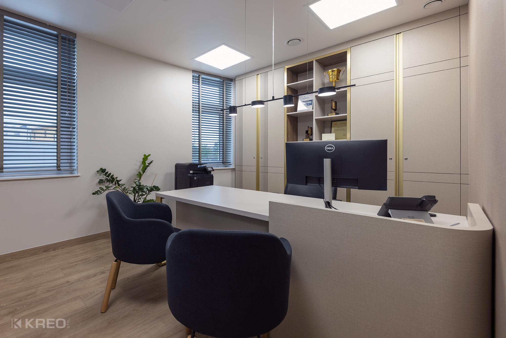 We designed and comprehensively fitted out the bank's space, creating an interior that combines the functionality of a public institution with a sense of trust and security. Our task was not only to create an ergonomic and modern workspace but also to give it a unique character – consistent with the prestige and mission of the financial institution. In the implementation, we used natural materials and minimalist forms that emphasize professionalism while simultaneously instilling peace and harmony. This ensures that the bank's stakeholders feel fully cared for, and employees feel safe and focused on their duties. The interior is equipped with custom-made office furniture: built-ins, desks, chairs, and tables that support daily work and ensure comfort. The director's office occupies a special place in the design – an elegant, representative space conducive to key decision-making. Subtle gold accents in the furniture handles and details evoke values and financial stability, without overwhelming the minimalist composition. Also noteworthy are the veneered column upholstery and the flush-fitting door to the director's office – elements that demonstrate precision craftsmanship and attention to detail. The overall effect is a space that exudes confidence, tranquility, and elegance. The main hall features upholstered sofas and chairs for clients, whose shapes and materials perfectly complement the other furnishings, creating a cohesive, aesthetic, and functional whole. The bathroom, whose design fully complements the overall design, completes the overall look. Our project for the bank is an example of how commercial interior design can combine a representative character with ergonomics and durability, offering solutions tailored to the needs of the most demanding institutions.