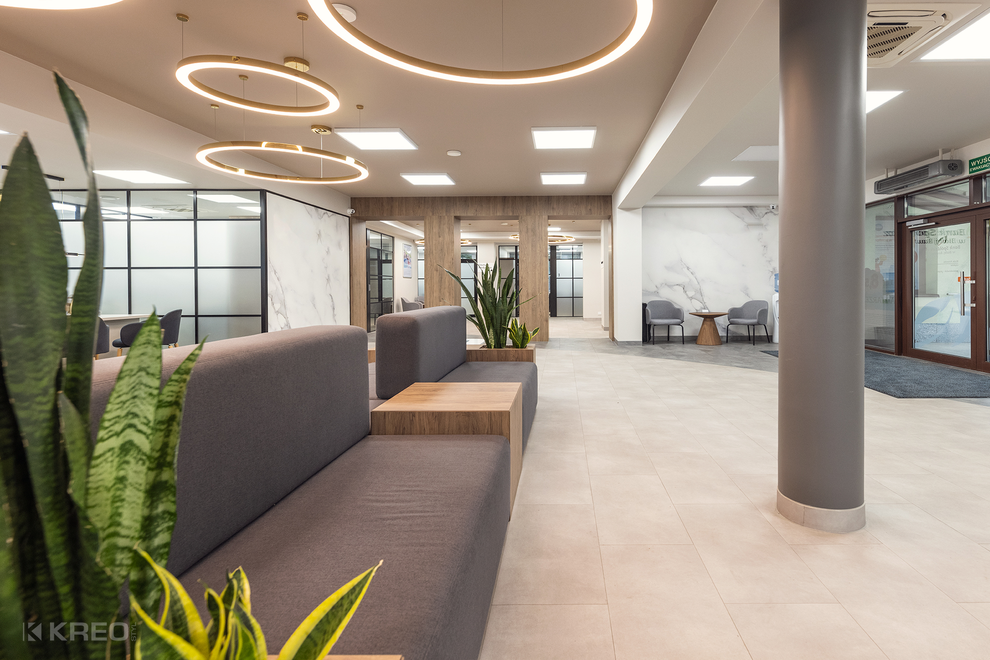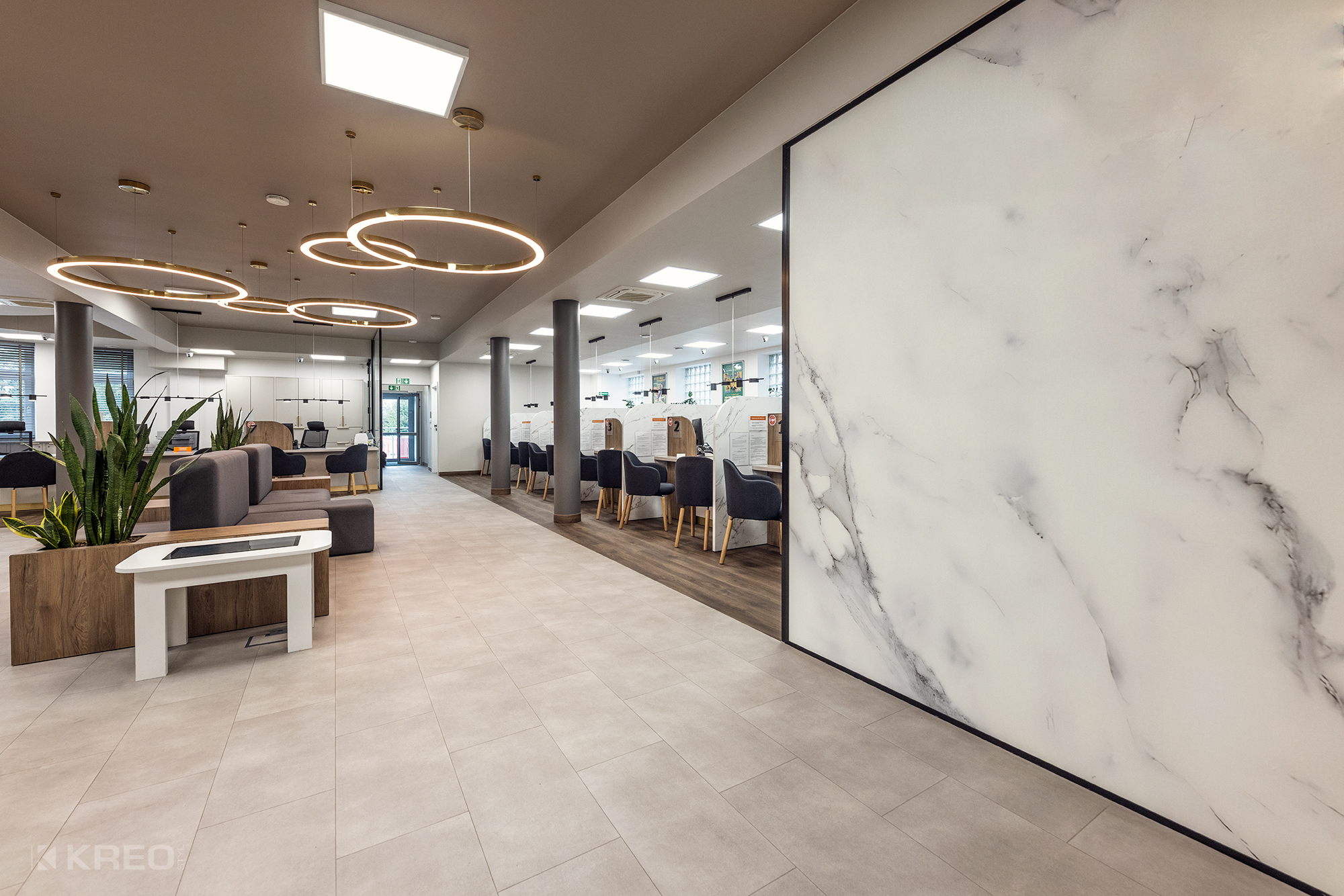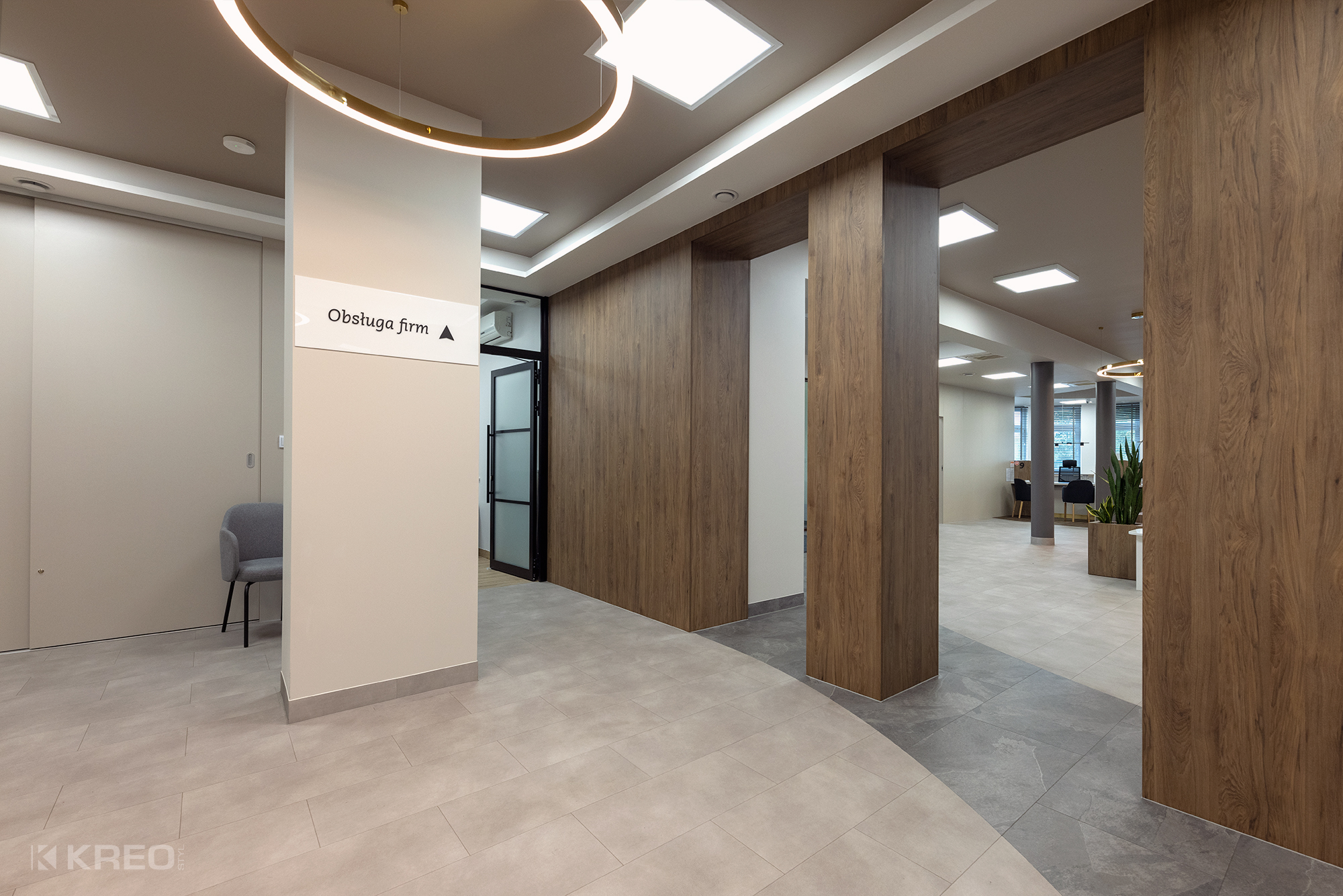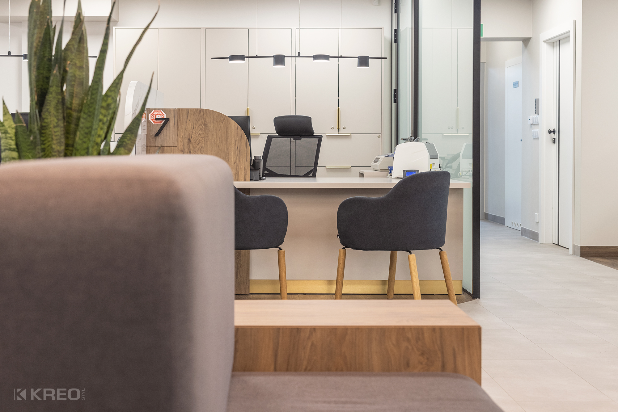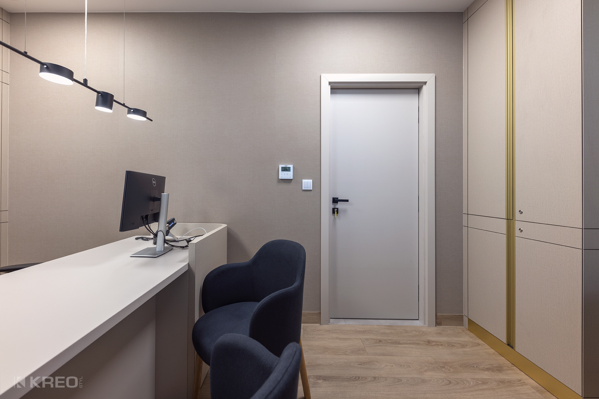 We designed and comprehensively fitted out the bank's space, creating an interior that combines the functionality of a public institution with a sense of trust and security. Our task was not only to create an ergonomic and modern workspace but also to give it a unique character – consistent with the prestige and mission of the financial institution. In the implementation, we used natural materials and minimalist forms that emphasize professionalism while simultaneously instilling peace and harmony. This ensures that the bank's stakeholders feel fully cared for, and employees feel safe and focused on their duties. The interior is equipped with custom-made office furniture: built-ins, desks, chairs, and tables that support daily work and ensure comfort. The director's office occupies a special place in the design – an elegant, representative space conducive to key decision-making. Subtle gold accents in the furniture handles and details evoke values and financial stability, without overwhelming the minimalist composition. Also noteworthy are the veneered column upholstery and the flush-fitting door to the director's office – elements that demonstrate precision craftsmanship and attention to detail. The overall effect is a space that exudes confidence, tranquility, and elegance. The main hall features upholstered sofas and chairs for clients, whose shapes and materials perfectly complement the other furnishings, creating a cohesive, aesthetic, and functional whole. The bathroom, whose design fully complements the overall design, completes the overall look. Our project for the bank is an example of how commercial interior design can combine a representative character with ergonomics and durability, offering solutions tailored to the needs of the most demanding institutions.