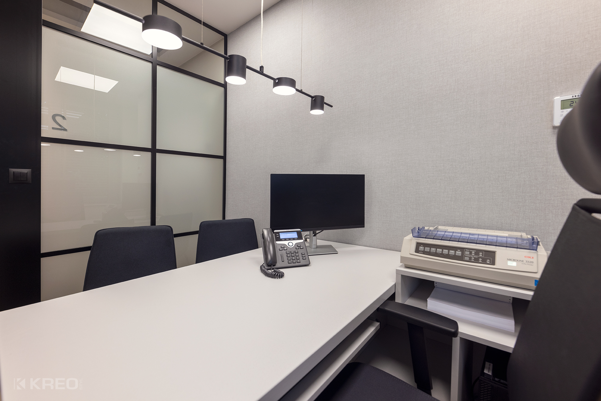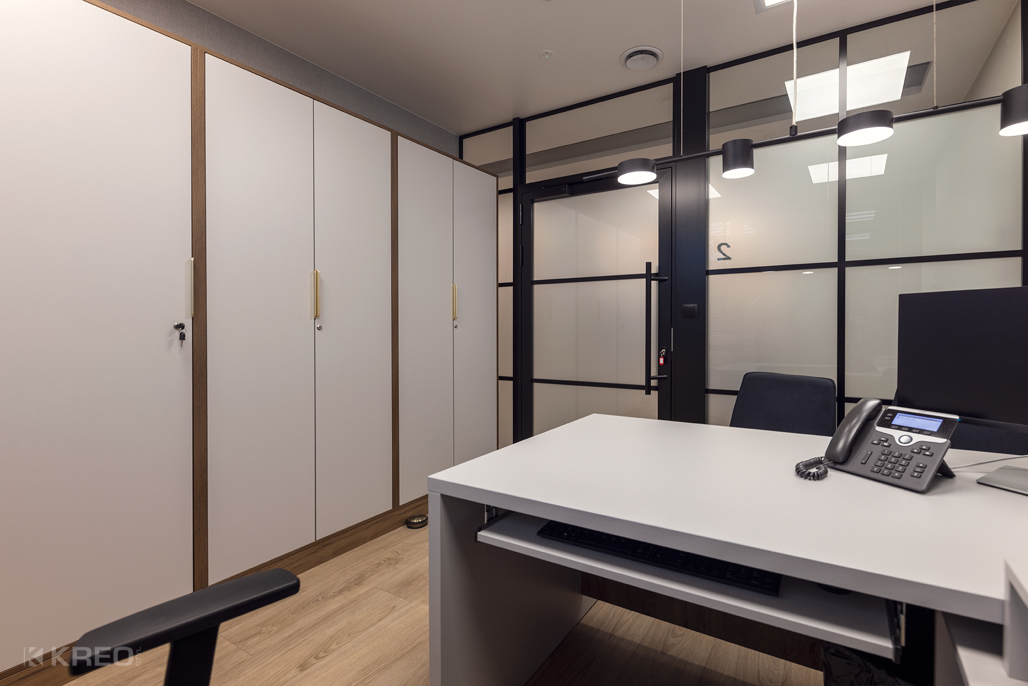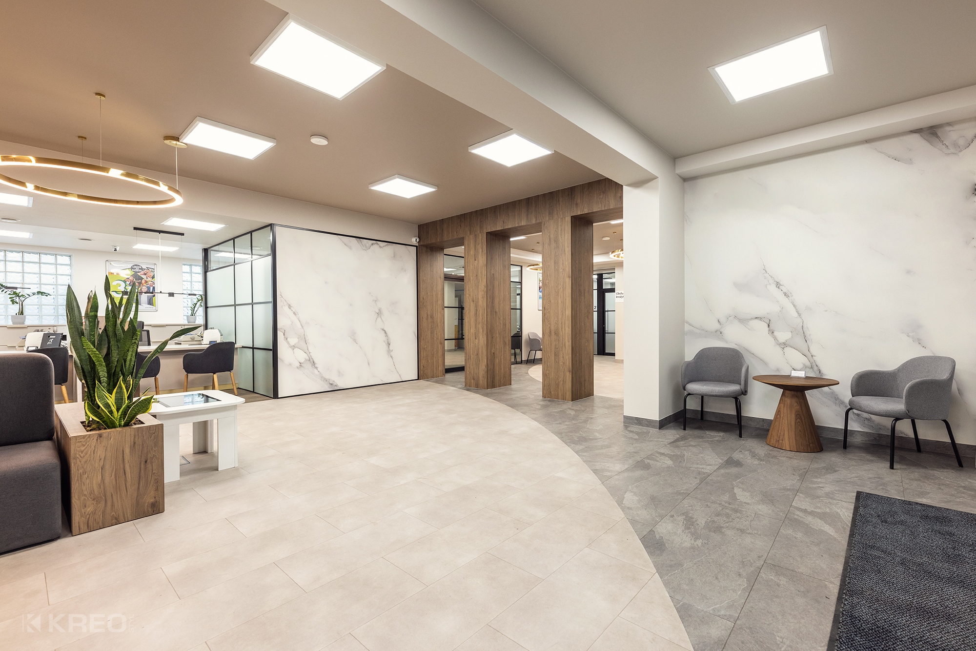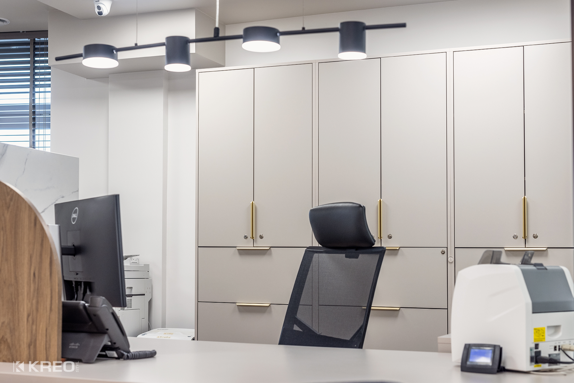 We designed and comprehensively fitted out the bank's space, creating an interior that combines the functionality of a public institution with a sense of trust and security. Our task was not only to create an ergonomic and modern workspace but also to give it a unique character – consistent with the prestige and mission of the financial institution. In the implementation, we used natural materials and minimalist forms that emphasize professionalism while simultaneously instilling peace and harmony. This ensures that the bank's stakeholders feel fully cared for, and employees feel safe and focused on their duties. The interior is equipped with custom-made office furniture: built-ins, desks, chairs, and tables that support daily work and ensure comfort. The director's office occupies a special place in the design – an elegant, representative space conducive to key decision-making. Subtle gold accents in the furniture handles and details evoke values and financial stability, without overwhelming the minimalist composition. Also noteworthy are the veneered column upholstery and the flush-fitting door to the director's office – elements that demonstrate precision craftsmanship and attention to detail. The overall effect is a space that exudes confidence, tranquility, and elegance. The main hall features upholstered sofas and chairs for clients, whose shapes and materials perfectly complement the other furnishings, creating a cohesive, aesthetic, and functional whole. The bathroom, whose design fully complements the overall design, completes the overall look. Our project for the bank is an example of how commercial interior design can combine a representative character with ergonomics and durability, offering solutions tailored to the needs of the most demanding institutions.
