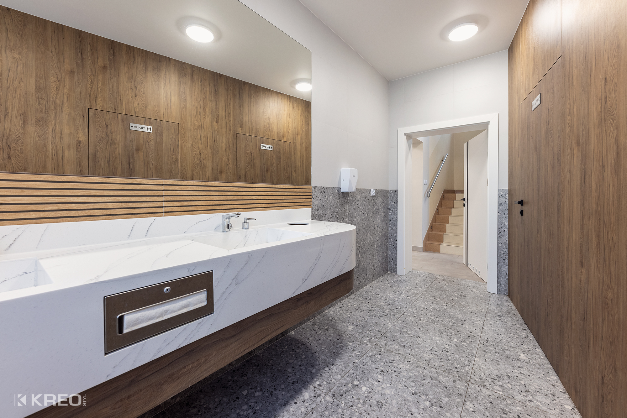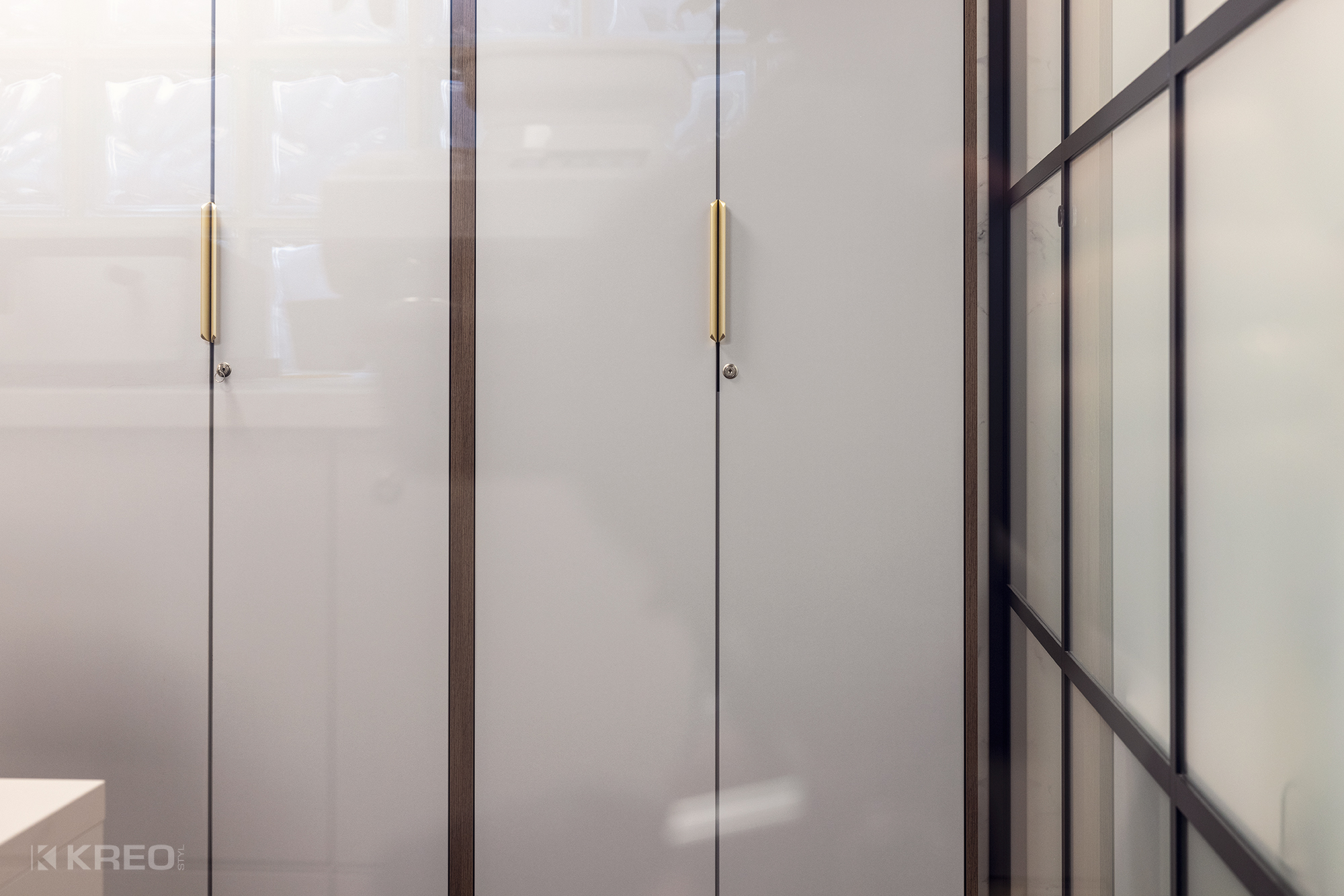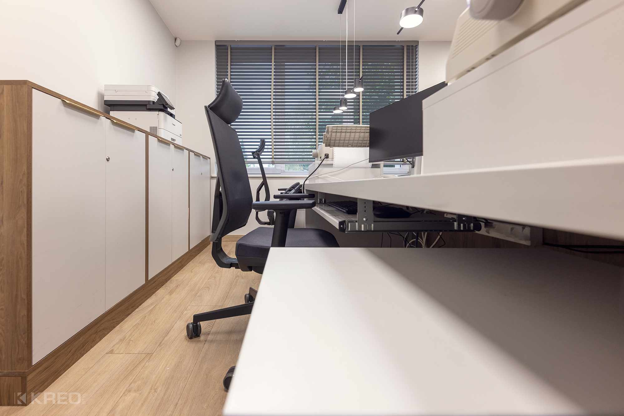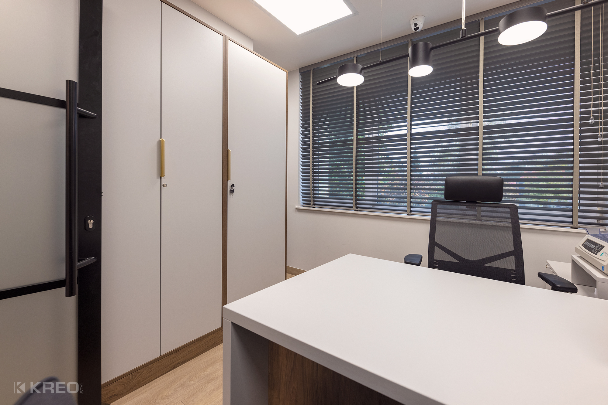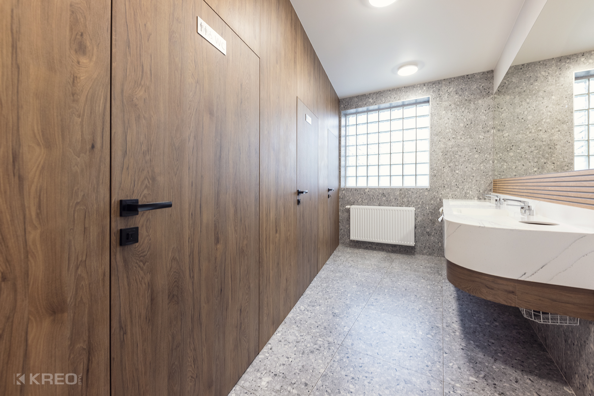 We designed and comprehensively fitted out the bank's space, creating an interior that combines the functionality of a public institution with a sense of trust and security. Our task was not only to create an ergonomic and modern workspace but also to give it a unique character – consistent with the prestige and mission of the financial institution. In the implementation, we used natural materials and minimalist forms that emphasize professionalism while simultaneously instilling peace and harmony. This ensures that the bank's stakeholders feel fully cared for, and employees feel safe and focused on their duties. The interior is equipped with custom-made office furniture: built-ins, desks, chairs, and tables that support daily work and ensure comfort. The director's office occupies a special place in the design – an elegant, representative space conducive to key decision-making. Subtle gold accents in the furniture handles and details evoke values and financial stability, without overwhelming the minimalist composition. Also noteworthy are the veneered column upholstery and the flush-fitting door to the director's office – elements that demonstrate precision craftsmanship and attention to detail. The overall effect is a space that exudes confidence, tranquility, and elegance. The main hall features upholstered sofas and chairs for clients, whose shapes and materials perfectly complement the other furnishings, creating a cohesive, aesthetic, and functional whole. The bathroom, whose design fully complements the overall design, completes the overall look. Our project for the bank is an example of how commercial interior design can combine a representative character with ergonomics and durability, offering solutions tailored to the needs of the most demanding institutions.